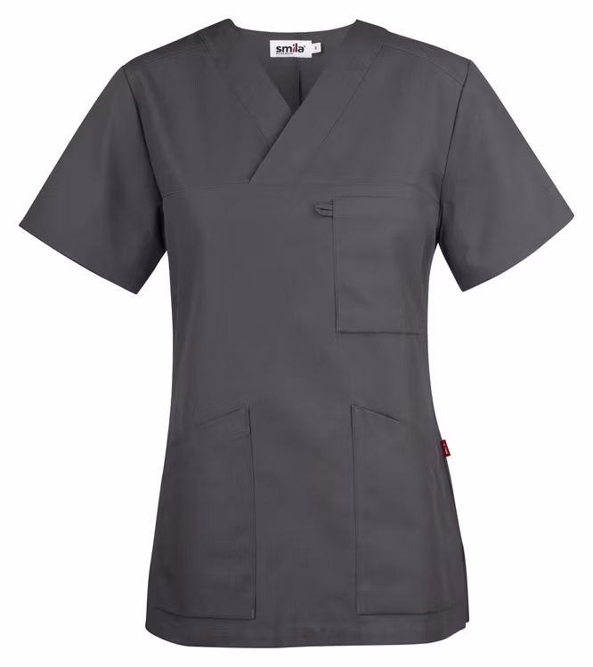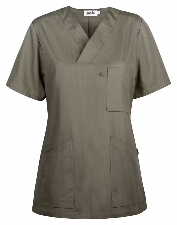 Snygg klassisk V-blus med figurnära och bekväm passform, något insvängd i midjan. Rymliga utanpåfickor fram, varav en med nyckelhållare. Bröstficka med korthållare. Modellen har något större skillnad mellan storlekarna. Rygglängd 72,5 cm i storlek M.